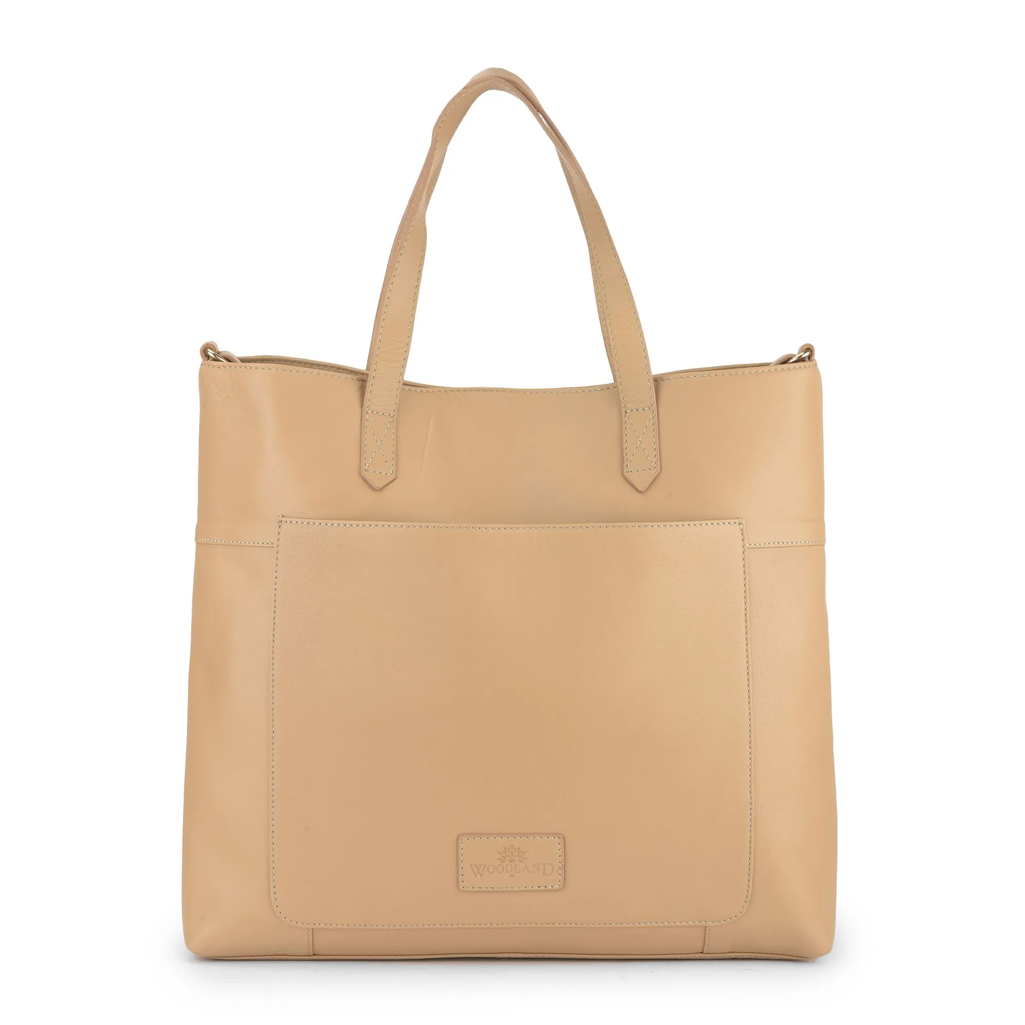 - Versatile tote by Woodland is designed from sleek genuine leather and boasts of a voluminous storage compartment with sturdy adjustable shoulder straps and top handle. The beige leather tote bag features a polyester lining, top snap button closure, front slip in pocket for easy access to items, and a zipper pocket in the interior to safely stow away your essentials and is finished with Woodland branding on exterior.