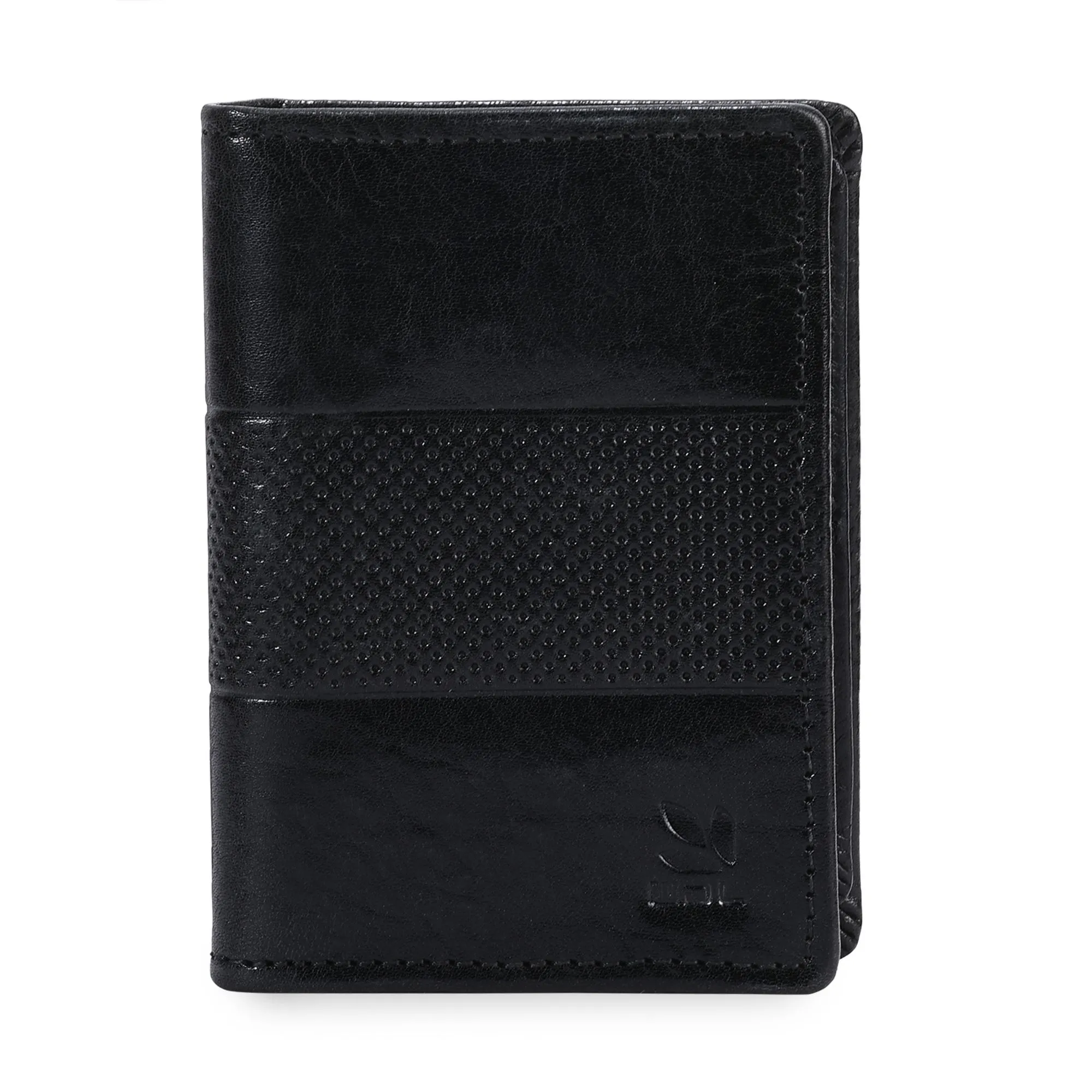 - This slim, lightweight and stunning black coloured menâs leather wallet is designed to give you a unique experience. Talking about utility, it features a big compartment, several card slots and two separate ID windows, which means a lot of space to accommodate your essentials safely. Crafted with utmost precision using the finest leather, it assures a long-lasting and sturdy use. This wallet is indeed a must-have for a stylish and dapper appearance!