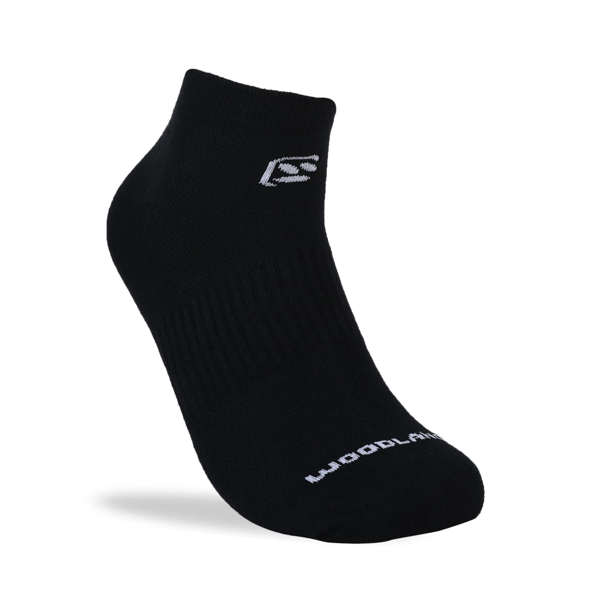 Comfortable pair of sports socks for men in black with contrast white colour Woodland logo branding over toes. The ribbed cuff keeps the sock in place all day long. The soft and breathable socks add comfort to your workout gear.