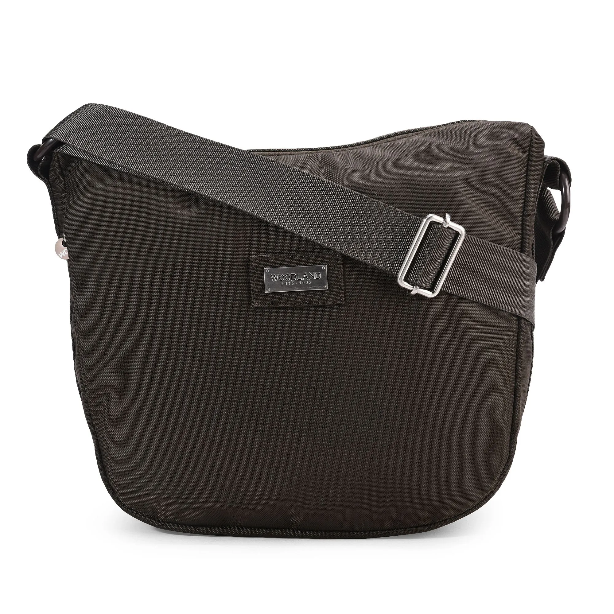 - Travel friendly sling bag in dark brown that has been crafted from durable nylon features a main zipped compartment with a small zipped pocket, a cover flap and a webbed strap that is adjustable. The bag can be carried on the shoulders or worn cross body too.