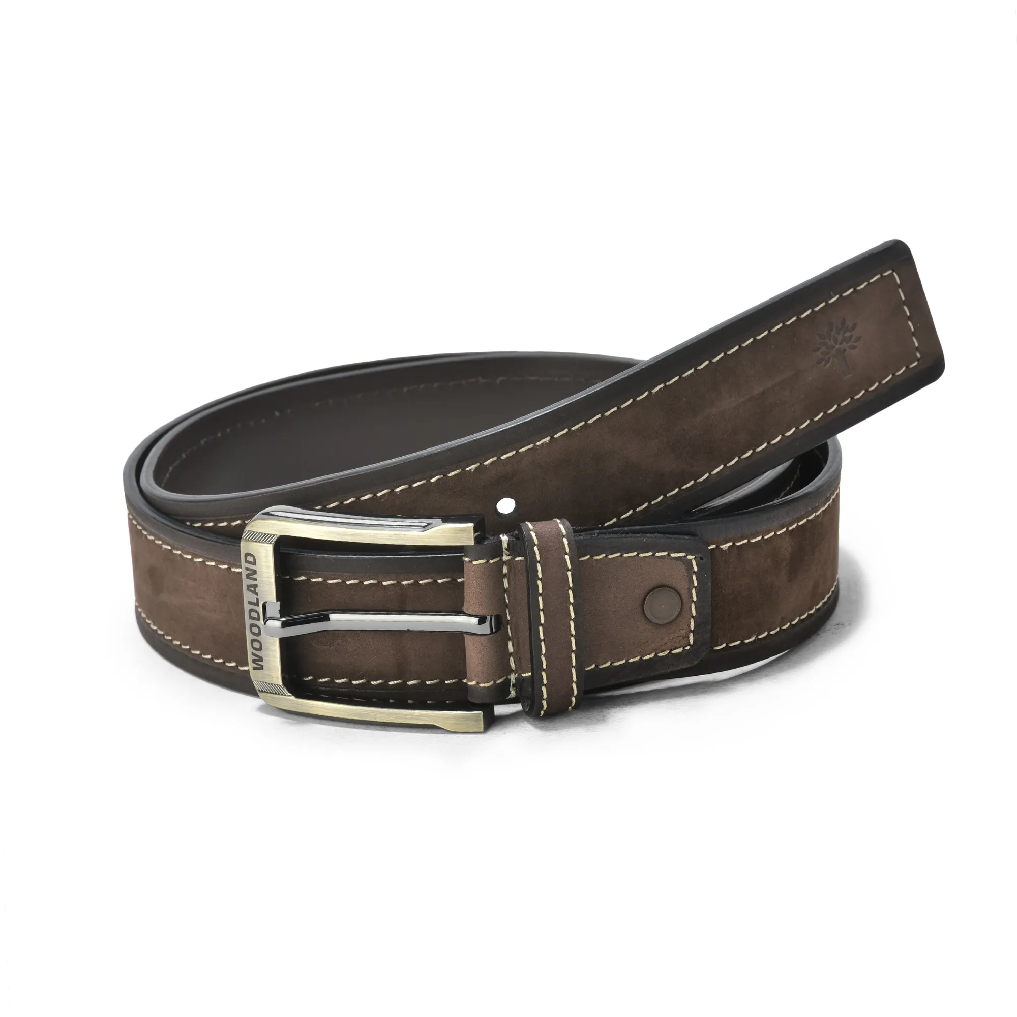 This brown nubuck leather belt gets a fresh update with crisp white border stitching—bringing Woodland’s rugged precision into everyday elegance. The polished silver buckle adds structure while the detailed contrast ensures standout appeal. Wear it with tailored trousers or crisp denims for a bold, structured finish. A must-have that balances utility with timeless charm.