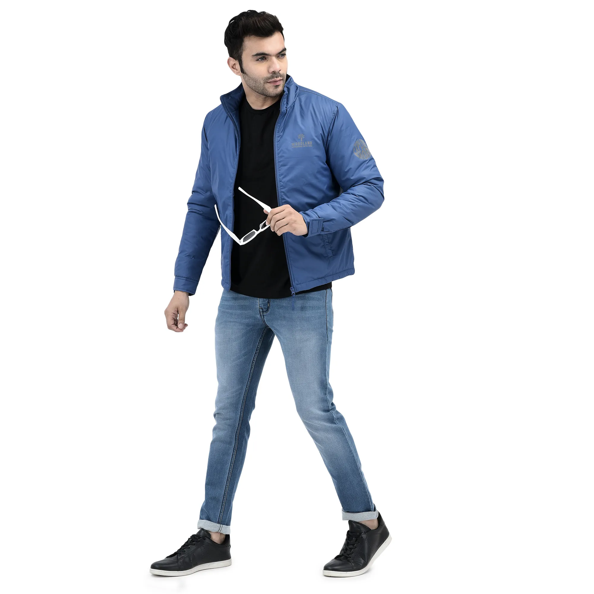 - Sleek rblue jacket is topped with a stand collar and cuff detail on sleeves. The jacket has polyester construction, long sleeves, two side pockets, and is finished with Woodland branding on chest and on right arm.
