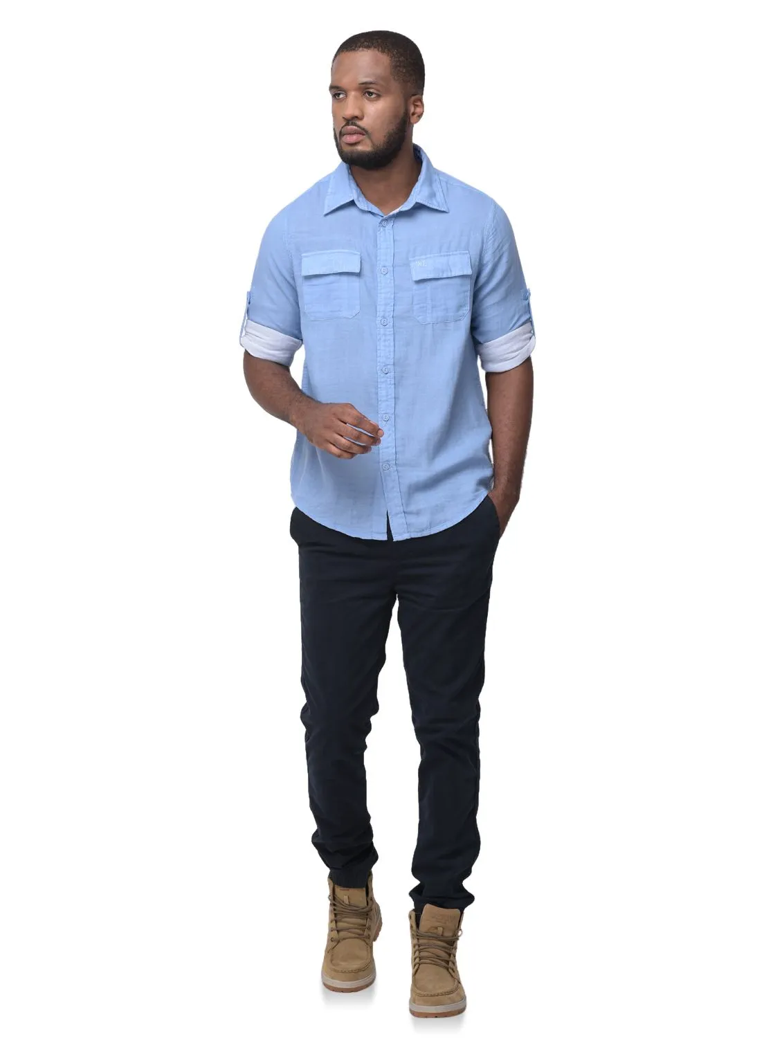 - Airy, and comfortable cotton shirt for men in sea blue and white from Woodland brings comfort that moves with you all day long. The shirt features full sleeves, a collared neckline and a front button placket.