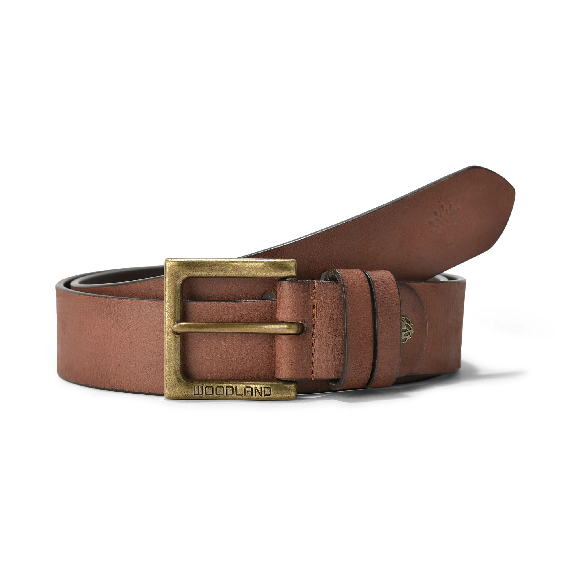 - Give a stylish upgrade to your collection of accessories by owning this classic tan leather belt from Woodland. Designed for the modern man, this neatly textured belt exudes a premium finish and gives a very elegant look. It has been carved out of fine leather, and will therefore maintain its quality and look for years to come. The buckle closure in dull antique gold is just a perfect contrast to the colour of the belt. Good to go with all your casual or formal outfits!