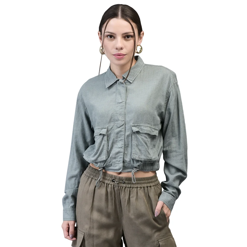 This ladies' long-sleeve top features a stylish snap button closure and functional front pockets on both sides, positioned at the bottom for a modern and practical touch.