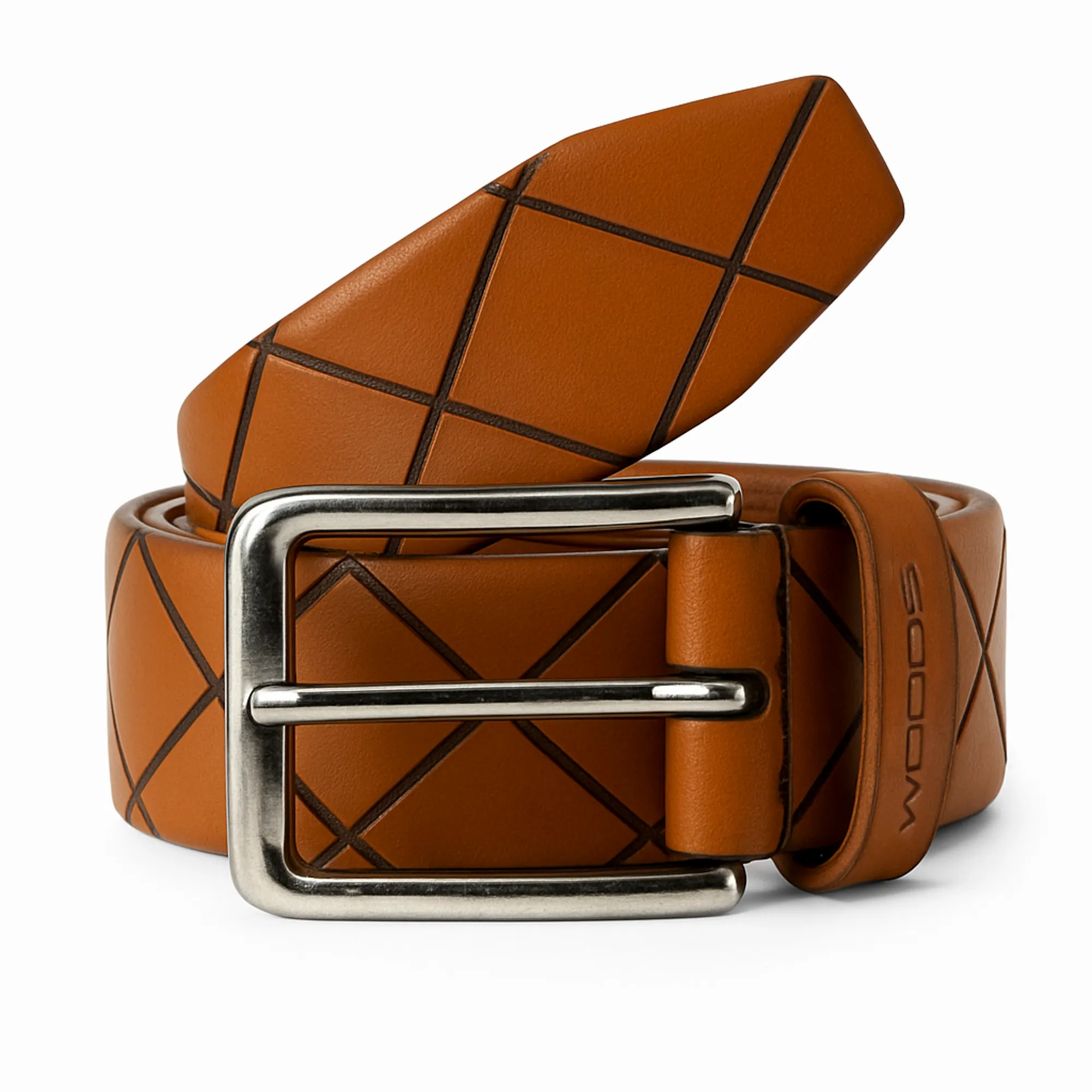 Crafted from premium tan leather, this belt features a geometric embossed pattern that adds depth and character. The brushed-metal buckle not only enhances its visual appeal but also ensures longevity, making it a staple accessory for any wardrobe.